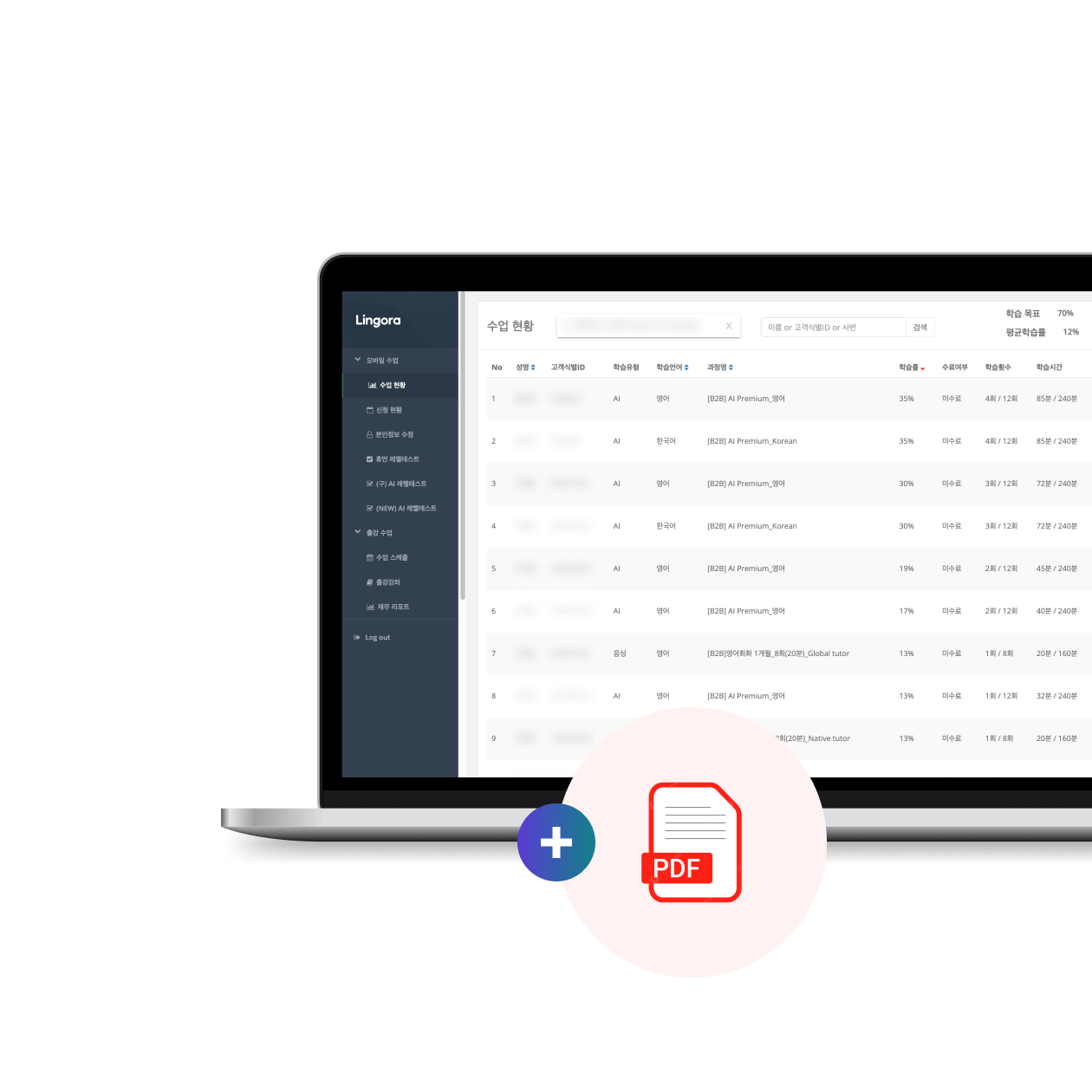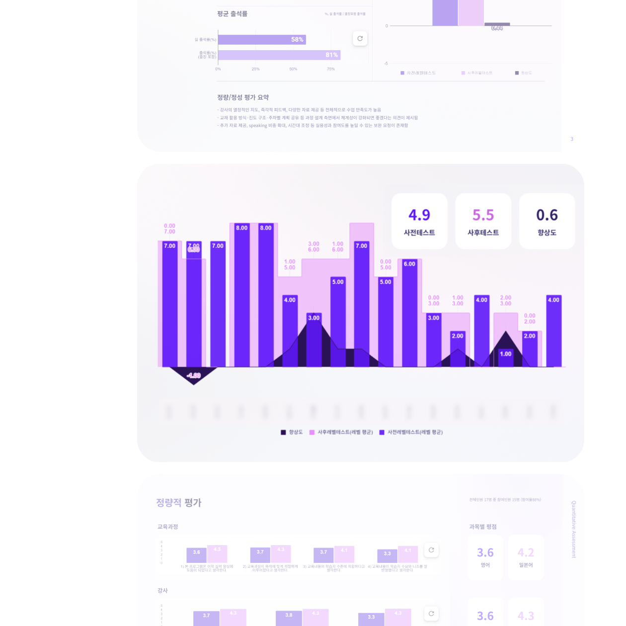 수강 종료 후 사후 레벨 테스트를 진행하고 학습 성과를 종합 분석한 결과 보고서를 제공합니다.